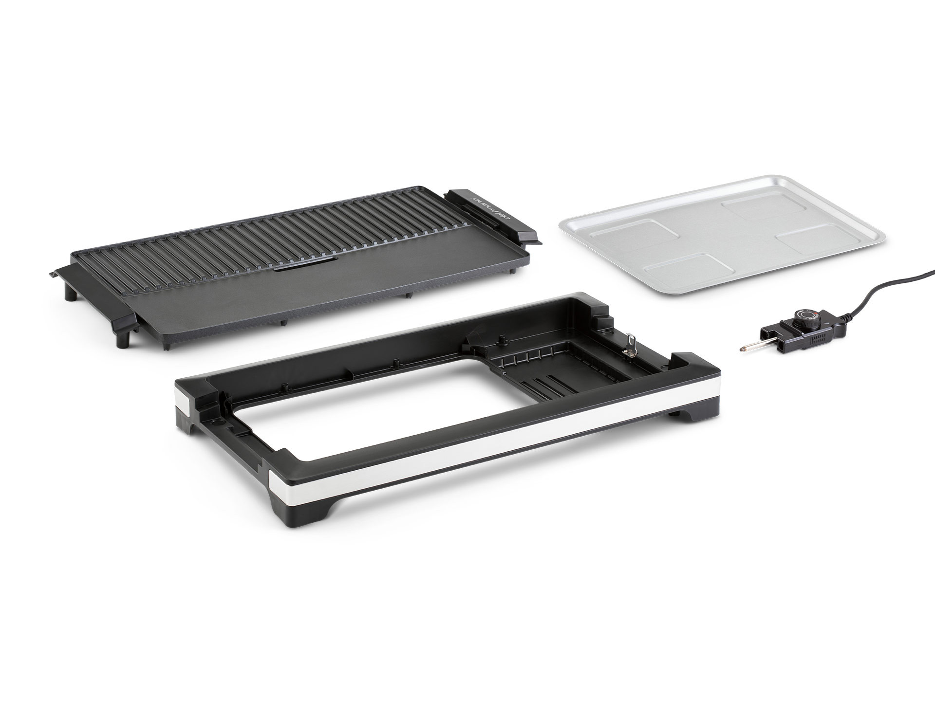Bucurati-va de gustul incomparabil al bucatelor la gratar pe tot parcursul anului datorita gratarului de masa Delimano Deluxe Noir. Poate fi folosit atat in casa, cat si afara, caci nu produce fum. Include o suprafata plata si cu striatii, in plus are acoperire antiaderenta Whitford pentru o experienta nemaipomenita in ale gatitului. 5 niveluri de temperatura. Suprafata de gatit: 51,5 x 25 cm.