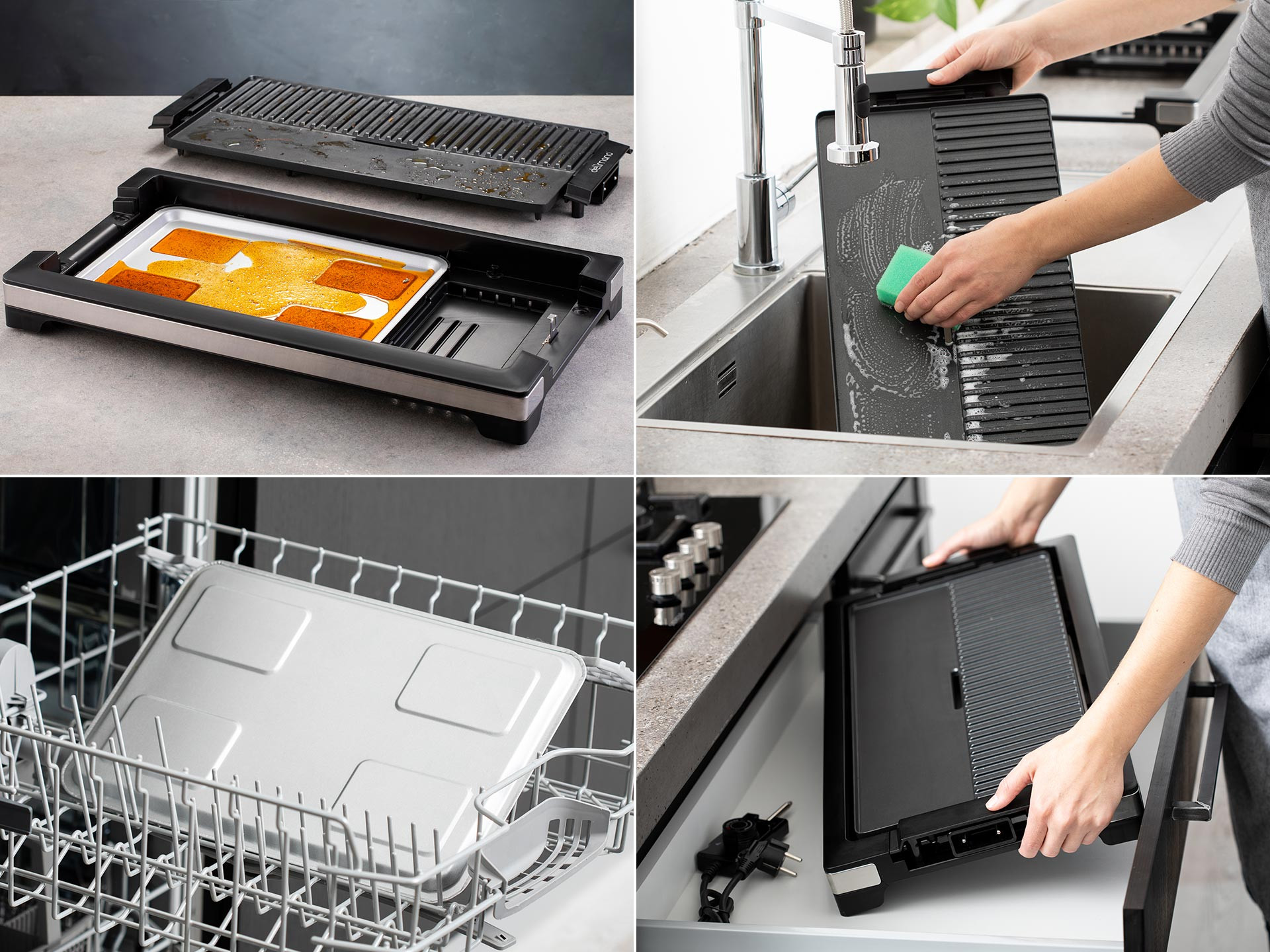 Acest gratar are o carcasa functionala – faptul ca poate fi inchis ajuta la mentinerea temperaturii constante, fara distingerea de zone calde si reci, oferind rezultate uimitoare. Cadrul, tava de picurare si suprafata gratarului sunt total detasabile, iar tava de picurare poate fi curatata chiar in masina de spalat vase.