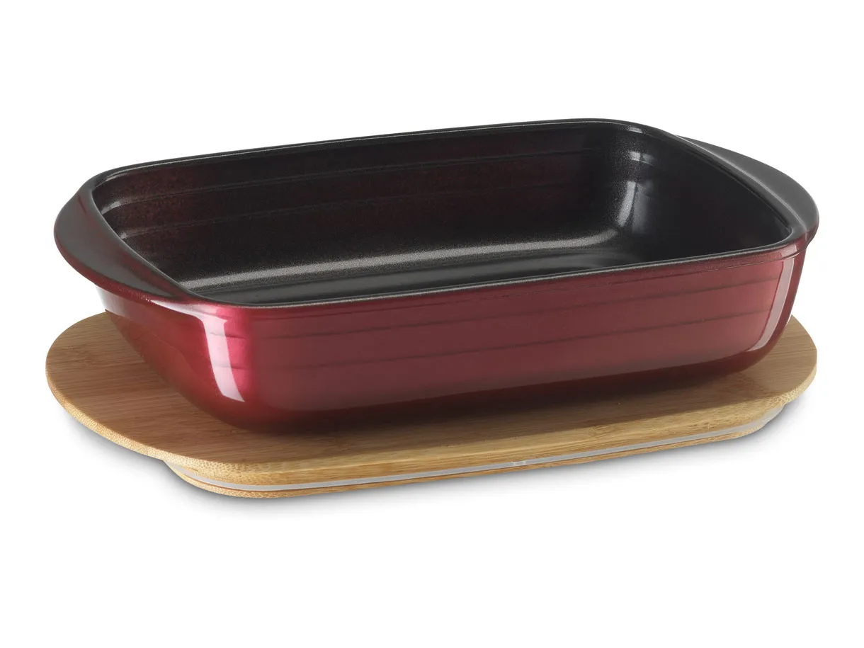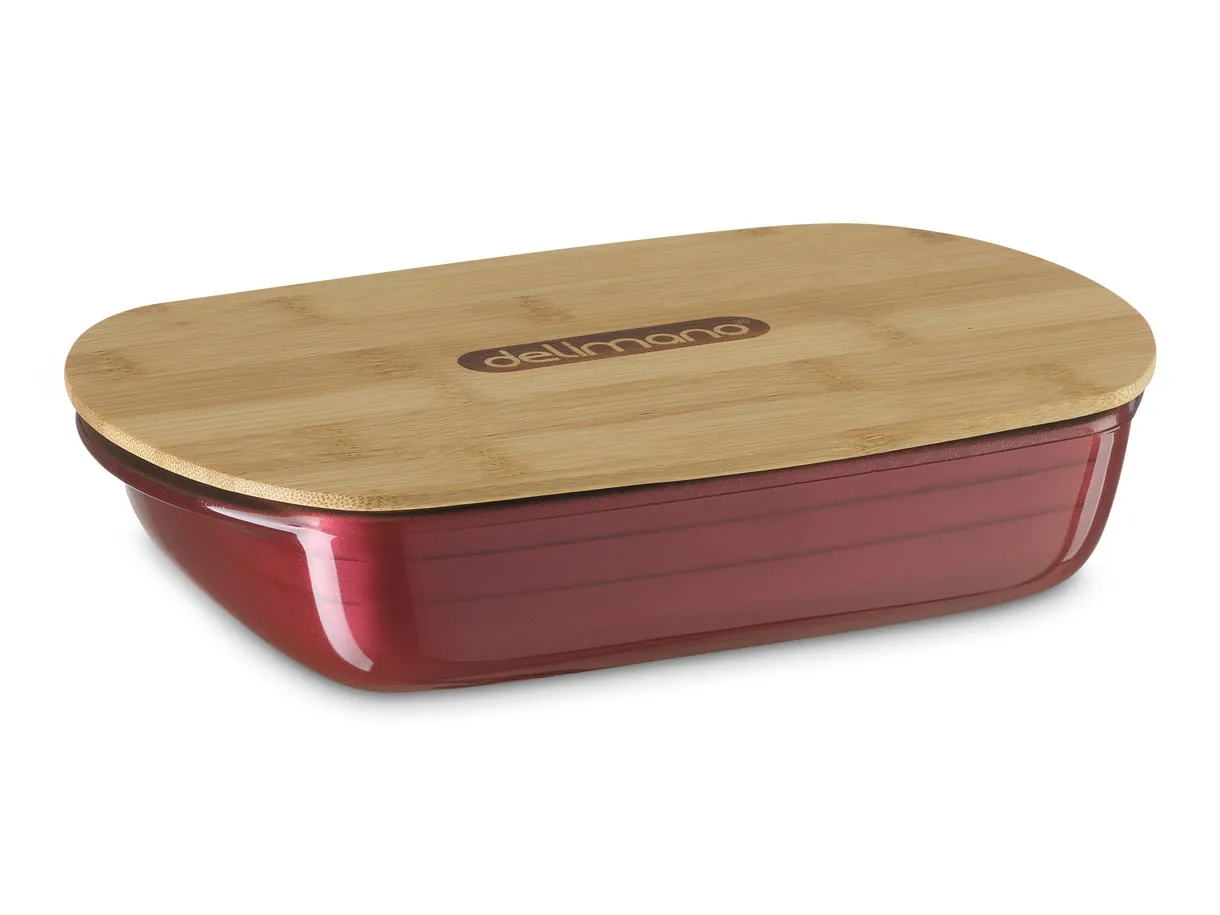 Setul include o tavă mică și un capac elegant din bambus. Combinația este excelentă pentru preparare, depozitare și servire. Poți aduce preparatul direct la masă – sticla transparentă oferă un aspect modern, iar capacul din bambus poate fi folosit ca suport care protejează suprafața mesei de temperaturi ridicate.