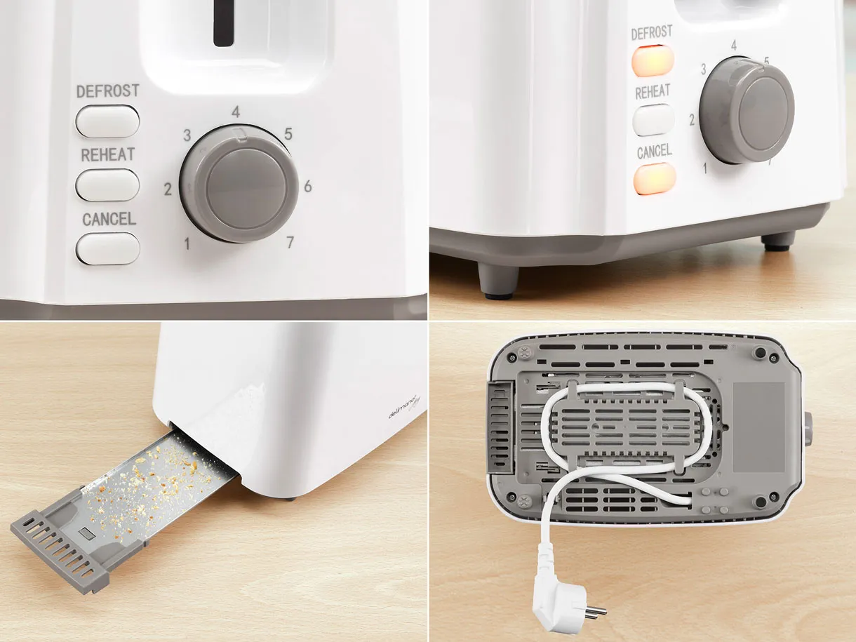 Toasterul Joy Delimano include funcții de decongelare, reîncălzire și anulare, oferind control deplin asupra procesului. Cu o putere de 750W, aparatul se încălzește rapid și prăjește simultan 2 felii de pâine. Mânerul special de ridicare face mai ușoară scoaterea feliilor mici, eliminând riscul de arsuri. Tava detașabilă pentru firimituri ușurează curățarea, iar compartimentul pentru cablu menține ordinea.